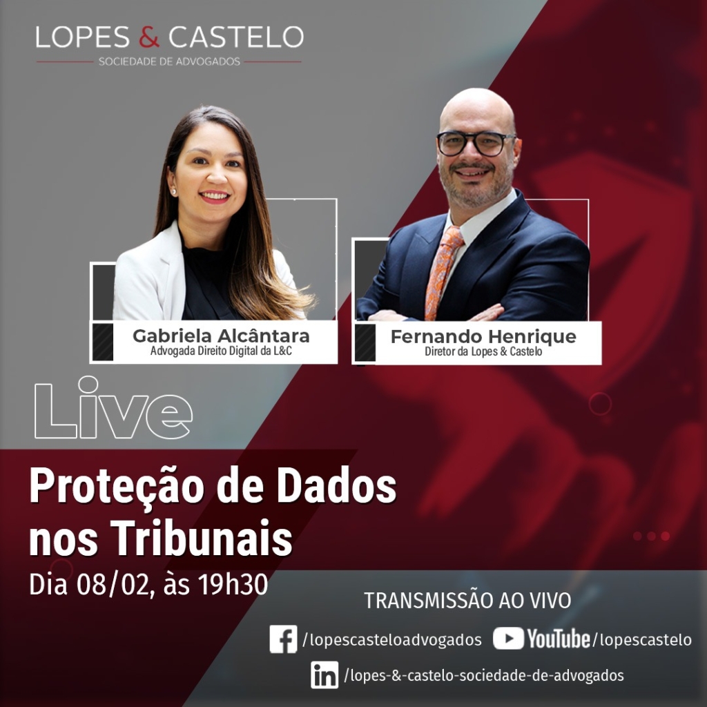 A Lopes & Castelo realizará mais um bate-papo no próximo dia 08 de fevereiro, às 19h30, desta vez para tratar da LGPD e a proteção de Dados nos Tribunais. Este evento será transmitido ao vivo pelo nosso canal do youtube/lopescastelo. Não deixem de participar! Acompanhe e mande suas dúvidas. Contamos com a sua participação!